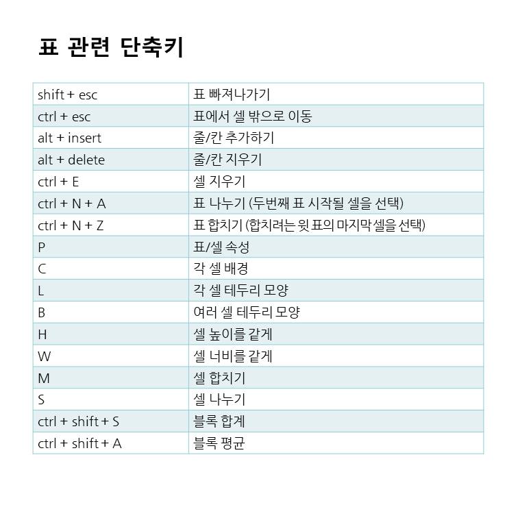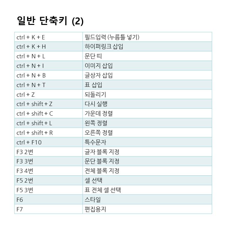 한글 자간, 줄간격, 특수문자 단축키 외에도 유용하게 사용할 수 있는 단축키가 정말 많은데요. 아래 표로 정리해두었으니 참고하셔서 효율적인 문서작업 하시면 좋겠습니다.